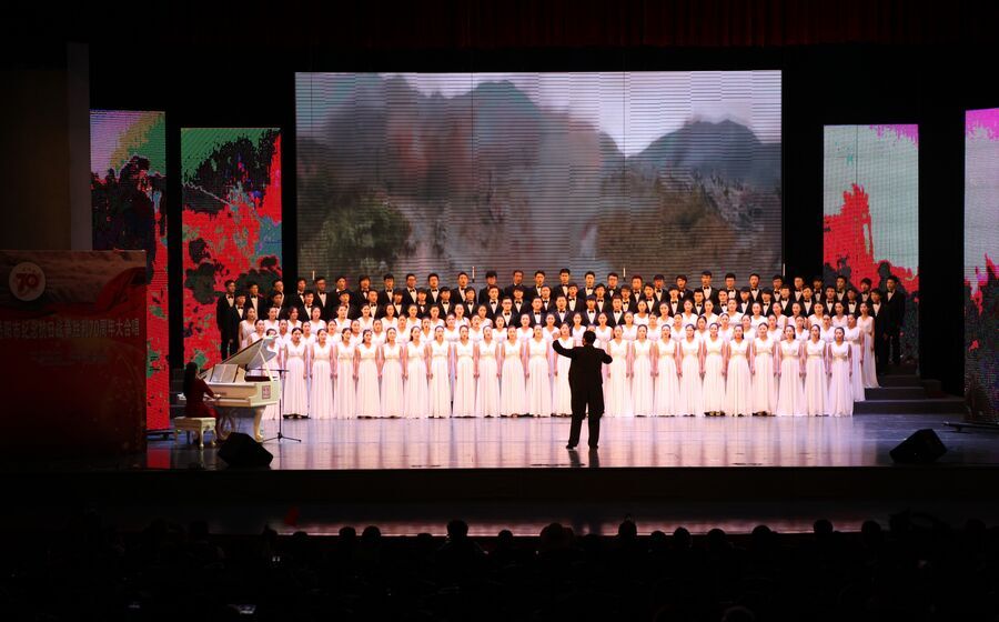 此次活动我校作为市委指派参演单位,由音乐学院师生共同组成了130人的大合唱队伍,并精心组织了排练。活动现场,我校合唱队压轴出场,完美演绎了《在太行山上》、《怒吼吧,黄河》两首红色经典歌曲,赢得了现场观众阵阵掌声,也展示了我校师生奋发向上的良好精神风貌。(宣传部)