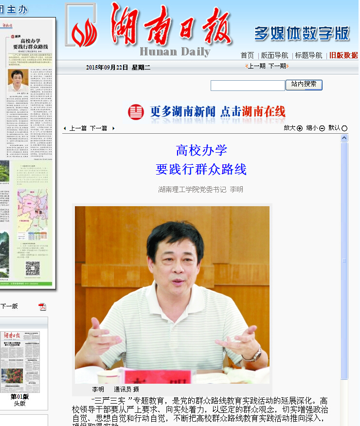 校园网讯 9月22日,学校党委书记李明在当天出版的《湖南日报》“观点版”发表了题为《高校办学要践行群众路线》的署名文章。