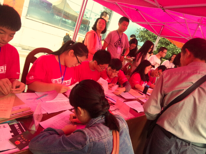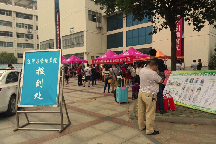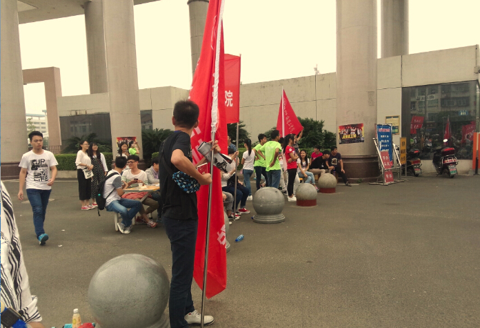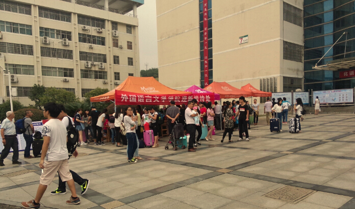 淅沥的小雨,却抵挡不住迎新生的热情。天刚刚亮,就看见校园里志愿者穿梭的身影。各色迎新队伍中,有帮忙拖行李的,有帮忙报名登记的,有帮忙介绍学校各方面情况的。节奏忙碌、急促,而又充实。