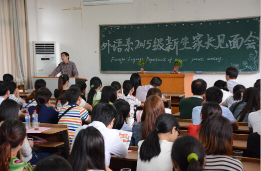 2号楼311教室,同样是座无虚席。外语系今年招收新生123人,有60名新生家长参加见面会。外语系主任张省林向家长们介绍了英语专业人才培养目标和学生实践能力培养的若干举措,通过开放语音室、演讲中心、影视配音中心、话剧中心供学生进行语言能力训练,举办学科专业技能竞赛,有效提高了学生专业应用能力,毕业生就业前景好。外语系党总支书记周红熳表示:举行新生家长见面会,有利于学生工作做得更实更细,更接地气,有实效。他们为了加强学校与学生家长的交流与沟通,在新生报到前就创建了新生家长QQ群和微信群,即时进行良性互动,解答了家长们的疑问。
