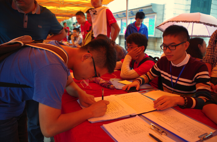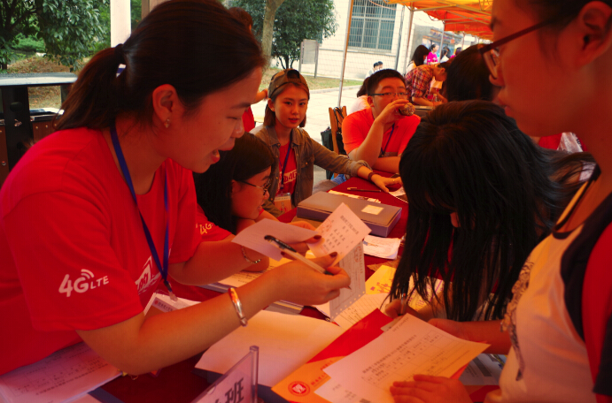 学校的迎新工作正在如火如荼地进行。今天的学校格外地热闹,到处都能看到拿着行李的新生和送自己孩子来学校的新生家长。除此之外。还有一道亮丽的风景线——参加迎新工作的学生干部。