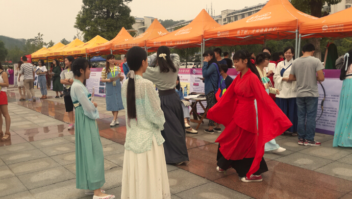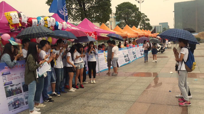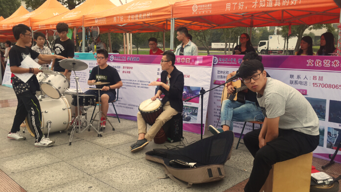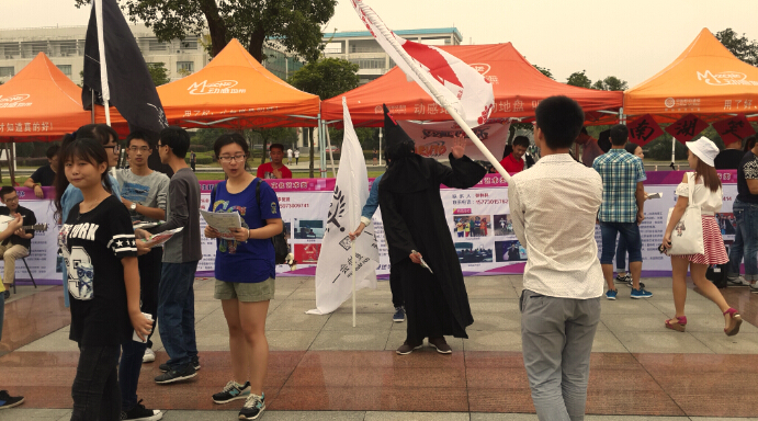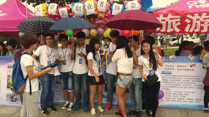 亚瑟动漫协会团员阿天穿着一席黑cosplay服,拿着协会的旗帜在云梦广场上不断挥舞,吸引了众多人与他合影,也吸引了更多的目光去了解他们协会。10点左右,开始飘起毛毛细雨,这时,广场上传来一阵歌声:“创协欢迎你”,10来个大学生创业者协会的成员举着雨伞,用歌声表达对新生的欢迎。同时他们也通过充当志愿者的角色带领新生到学院报道,赢得了新生对协会的好评。而架子鼓协会则在宣传点办起了一个小型音乐会,打着手鼓、弹着吉他,用音乐的律动展现协会的风采。