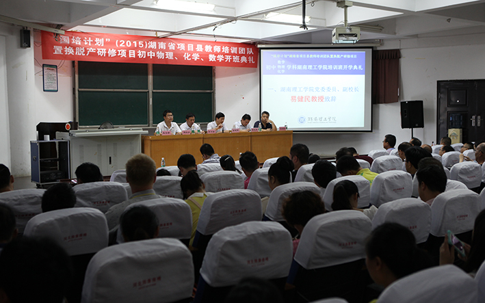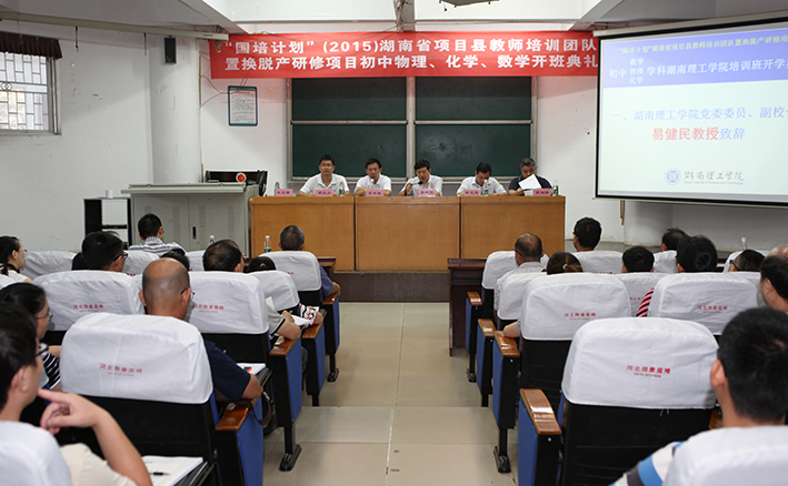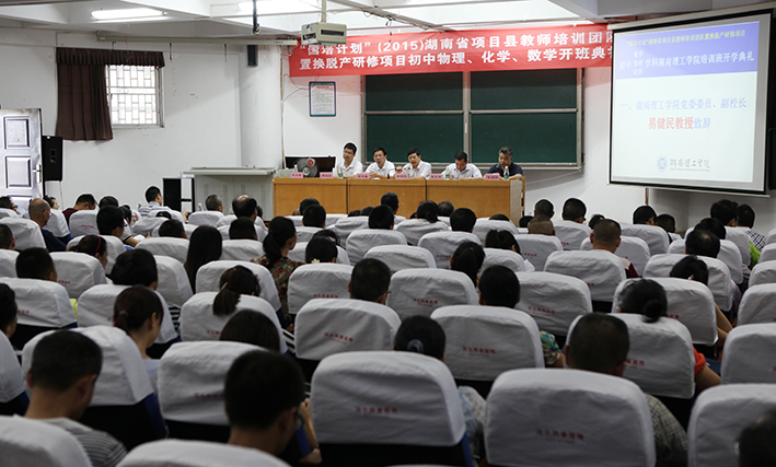 校园网讯 8月4日上午,“国培计划”(2015)湖南省项目县教师培训团队置换脱产研修项目初中物理、化学、数学湖南理工学院开班典礼在我校物电楼学术报告厅举行。