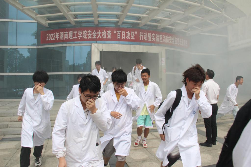 本次演练模拟7号教学楼二楼某实验室内因人为因素引发火灾。消防警报拉响后,在模拟的浓烟滚滚的火灾场景中,应急疏散演练开始。老师和同学们捂住口鼻,沿着指定楼梯口快速、有序撤离,短时间内全部安全疏散到指定位置。随后,岳阳市消防救援支队工作人员在7号教学楼前模拟讲解了防毒面具、二氧化灭火器和干粉灭火器的正确使用方法以及消防水带的使用操作流程等,让师生熟悉规范使用消防器材,增强防范意识和处理突发事件的能力。