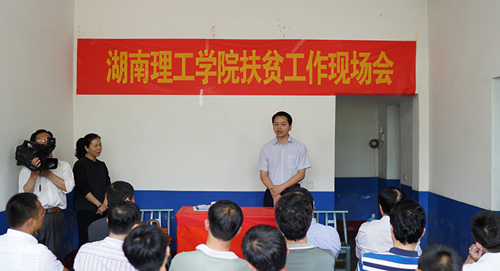 在大糙村农户家中,学校领导与平江县镇、村负责人以及村民代表一起召开了扶贫工作现场会。村民盛情端来热茶,大家坐在一起,会场气氛和谐热烈。会上,大糙村村支部书记介绍了村里的基本情况,感谢学校党委行政对扶贫点的关心与帮助,对学校派驻的工作组的辛勤劳动表示感谢。学校驻大糙村扶贫工作组组长姜剑鸣汇报了他和扶贫队员李钊两个月来的主要工作和摸底调查情况,一份份实地调查报告,一个个规章制度,一份份发展规划,详细展示了学校扶贫工作组这些天来深入细致的工作和为大糙村扶贫发展付出的辛勤劳动。黄伟雄在会上做了热情洋溢的讲话,介绍了平江经济社会发展的基本情况和未来发展的优势;对学校这些年坚持内涵发展,服务地方放经济社会发展表示深深的敬意。他承诺,地方党委政府一定会全力支持湖南理工学院扶贫工作组,在扶贫政策、经费、项目等方面给予倾斜。学校正校级督导员文艺文代表学校讲话。他指出,感谢地方政府及广大父老乡亲对学校扶贫工作的大力支持,对扶贫工作组的帮助和关心。学校将认真落实上级扶贫工作的精神,紧紧依靠地方政府,科学规划,全力投入,扎实工作,科学扶贫,精准扶贫,确保圆满完成扶贫任务,为大糙村创造更加美好的明天。