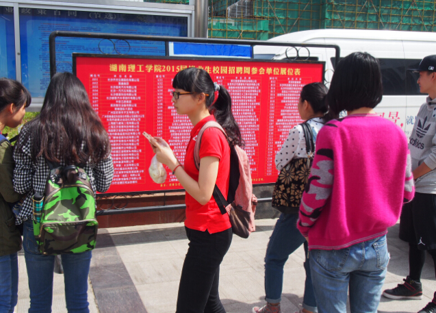 此次招聘活动一直要持续到5月15日,目前有来自广东、浙江、北京、上海、江苏、湖北等外地以及湖南本地用人单位307家报名参会,并且每天还有新的单位要求进校招聘,招聘岗位覆盖了我校所有专业。招聘第一天到场121家单位,提供了超过5000个工作岗位。