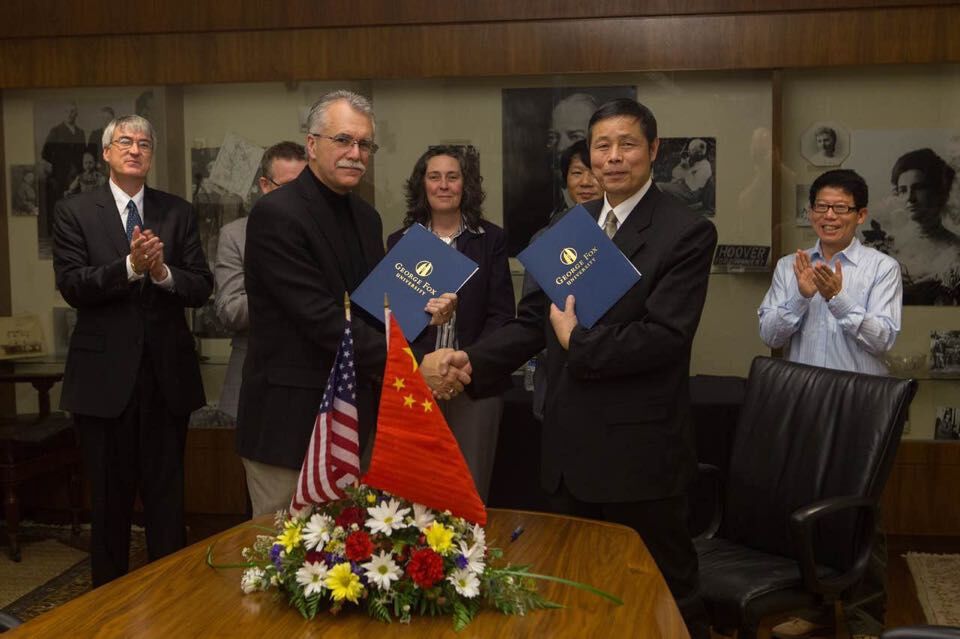 余三定与乔治福克斯大学校长罗宾•贝克在乔治福克斯大学纽伯格校区胡佛楼104会议室会晤,就两校合作与交流进行了诚挚友好的交谈,并代表双方学校签订了《学术合作协议备忘录》。