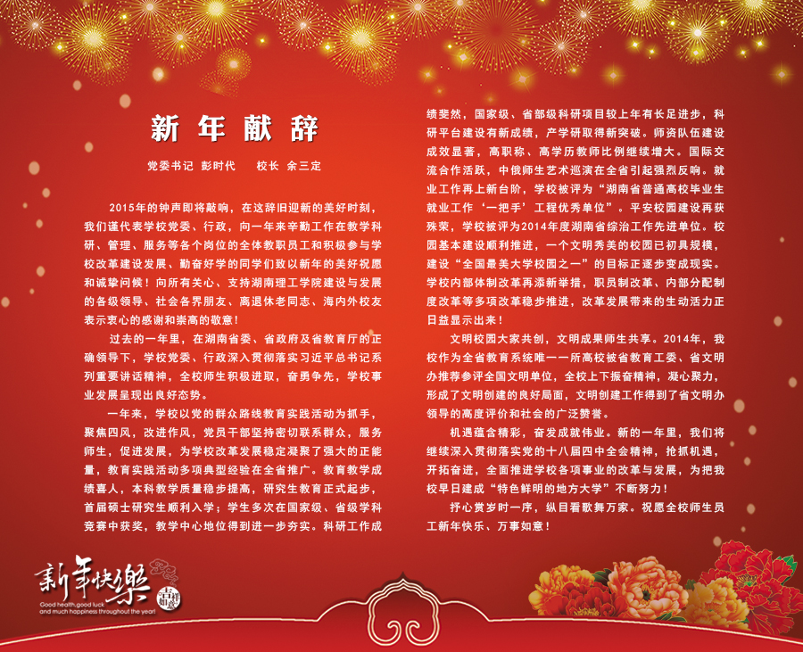 2015年的钟声即将敲响,在这辞旧迎新的美好时刻,我们谨代表学校党委、行政,向一年来辛勤工作在教学科研、管理、服务等各个岗位的全体教职员工和积极参与学校改革建设发展、勤奋好学的同学们致以新年的美好祝愿和诚挚问候!向所有关心、支持湖南理工学院建设与发展的各级领导、离退休老同志、海内外校友、社会各界朋友表示衷心的感谢和崇高的敬意!
