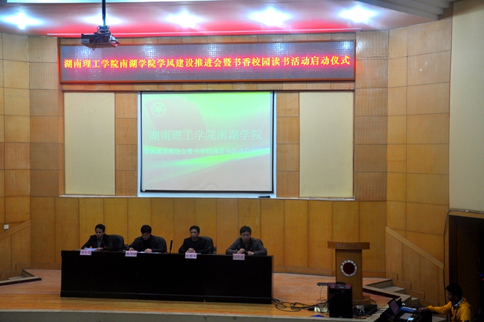 校园网讯 11月7日下午,南湖学院2014年下学期学风建设推进会暨书香校园读书活动启动仪式在图书馆学术报告厅举行。南湖学院负责人,全体学工干部和学生党员、学生干部代表参加会议。