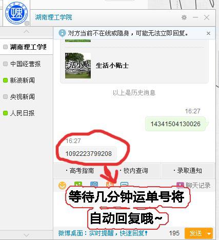 我校官方微博、微信开通查询录取通知书快递单号功能
