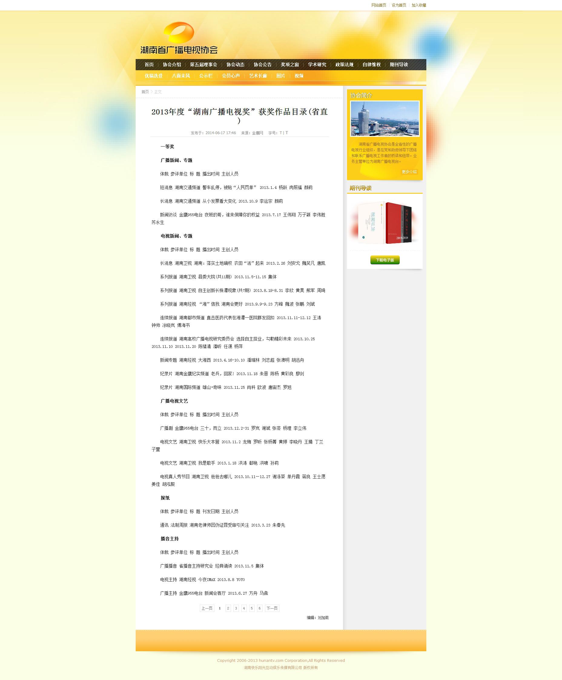 校园网讯 近日,湖南省广播电视协会官方网站公布了2013年度“湖南广播电视奖”获奖作品目录,我校作为全省高校唯一获奖单位,所选送的电视连续报道节目《选择自主择业,勾勒精彩未来》荣获电视新闻专题类一等奖。