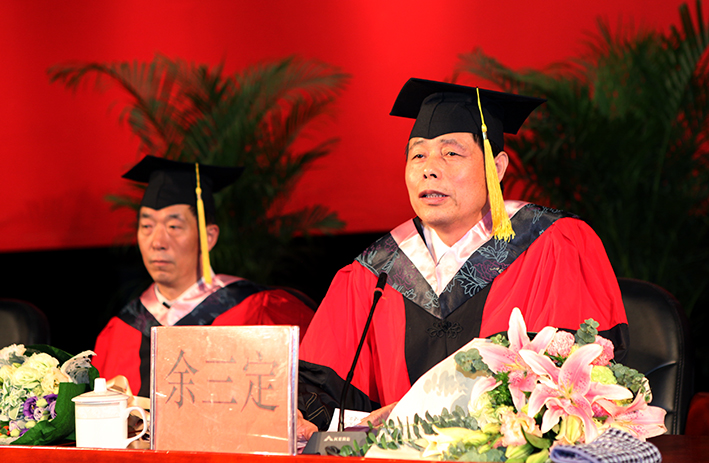 校长余三定作书面讲话,深情寄语2014届毕业生。一是要快乐读书,理由有两条:第一是由于我们事业的需要、工作的需要。在知识爆炸的信息时代,知识更新很快、发展很快,要适应未来的工作必须要不断学习;第二是由于我们人生的需要。中国人民大学著名哲学学者陈先达说一个把阅读当作生活方式、当作生命一部分的人能健康长寿。凡是喜欢读书,以读书为乐,勤于动脑的人,都比终日无所事事的人活得健康、活得明白。二是要关爱他人。最重要的一点就是待人以诚,保持童心。首先是要有孝心,孝敬长辈。同学们到今天为止主要是父母供养,从责任上说必须孝敬父母,更主要的是在血缘关系上要孝敬父母、亲近父母。其次要平等待人。蔡元培当北大校长,从校门走进来,跟谁都打招呼,包括门卫,搞卫生的人,碰到搞卫生的人还把帽子取下,表示敬意,这就是一种平等待人。三是要努力工作。同学们工作以后,与工作的关系和对工作的感受不外乎两种情况:一种是干了自己喜欢的工作,还有一种情况是干了不喜欢的工作。特别是有一些同学们毕业后有可能做的是自己不喜欢的工作,怎么办?我给同学们两个建议:一是先就业,干一段时间说不定就喜欢了;如果你干了不喜欢的工作,也可以等有了一定条件后,再换其他工作,主动权在自己手中。四是要享受生活。温家宝总理曾经说过,一方面要匆匆赶路,另一方面也要仰望星空,匆匆赶路是创造生活,仰望星空是享受生活。这里要指出的是,享受生活和追求物质享受不是一个概念,不是说物质条件好就是享受生活,享受生活和创造生活有时候是融合在一起的。北京大学陈平原教授说,最快乐的时候就是一本书写完了在写后记的时候。所以创造生活和享受生活是不矛盾的,是有机统一的。