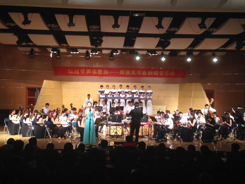 校园网讯 6月5日晚,“中国民族唱法经典作品音乐会系列之红楼梦声乐套曲——周俊英毕业独唱音乐会”在东院音乐厅举行,音乐会由音乐学院主办,音乐学院1203实验班同学创建的“精诚音乐活动策划实验室”承办。