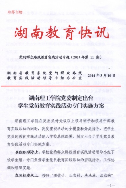 校园网讯 近日,湖南省教育系统党的群众路线教育实践活动领导小组办公室在《湖南教育快讯》以《湖南理工学院党委制定出台学生党员教育实践活动专门实施方案》为题,对我校在学生党员中开展教育实践活动的经验面向全省予以推介。