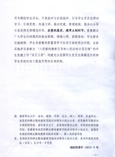 文章指出,湖南理工学院在突出抓好处级以上领导班子和领导干部教育实践活动的同时,高度重视活动的全覆盖和分类指导,把学生党员的教育实践活动纳入学校总体部署,制定出台了学生党员教育实践活动专门实施方案。
