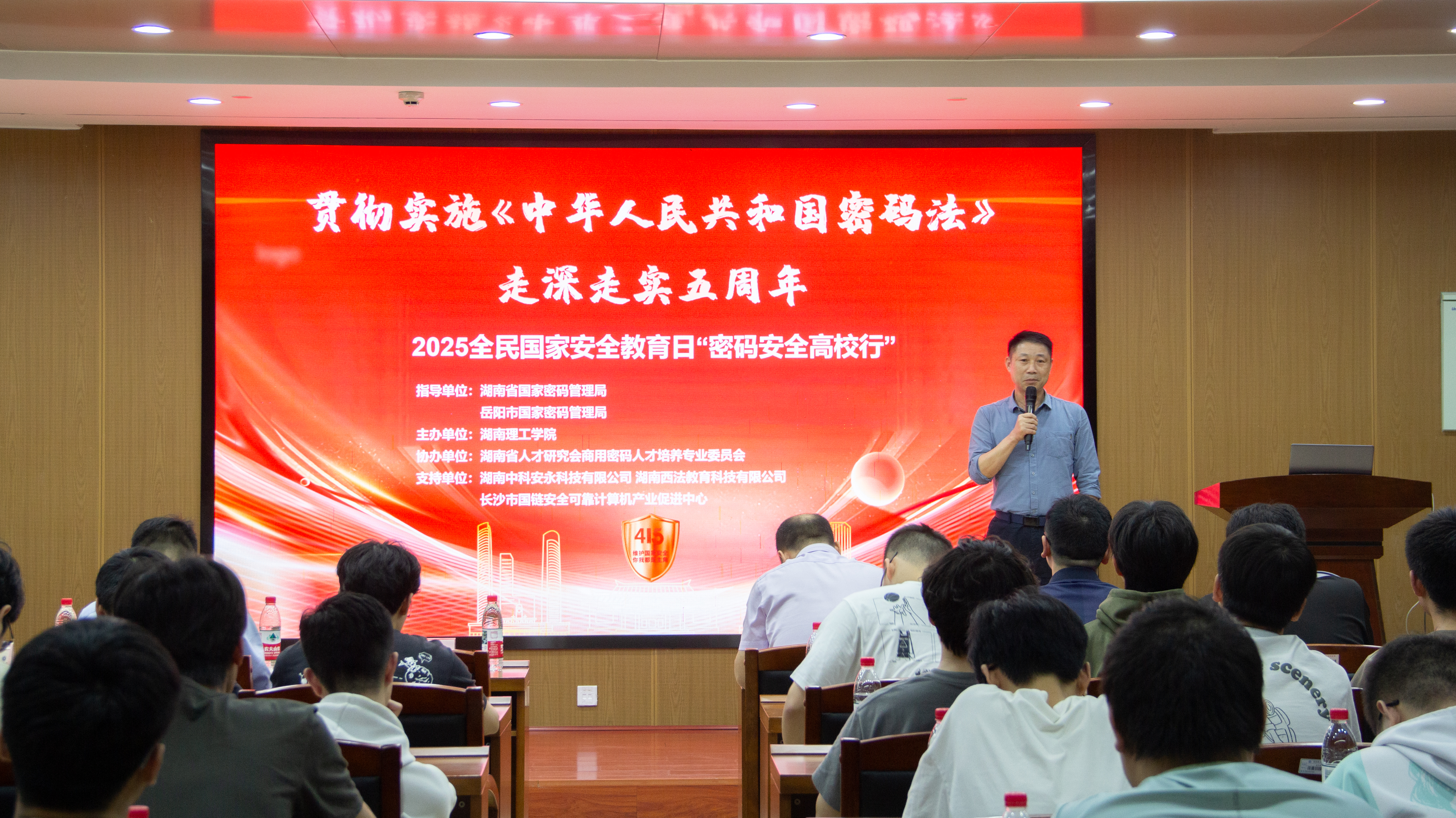 校园网讯 4月11日,2025年全民国家安全教育日“密码安全高校行”活动在学校举行。岳阳市国家密码管理局局长李岸,湖南中科安永科技有限公司副总经理荀莎,湖南省人才研究会商用密码人才培养专委会特聘讲师付柳兵,保卫部、党政办负责人及信息学院师生参加活动。