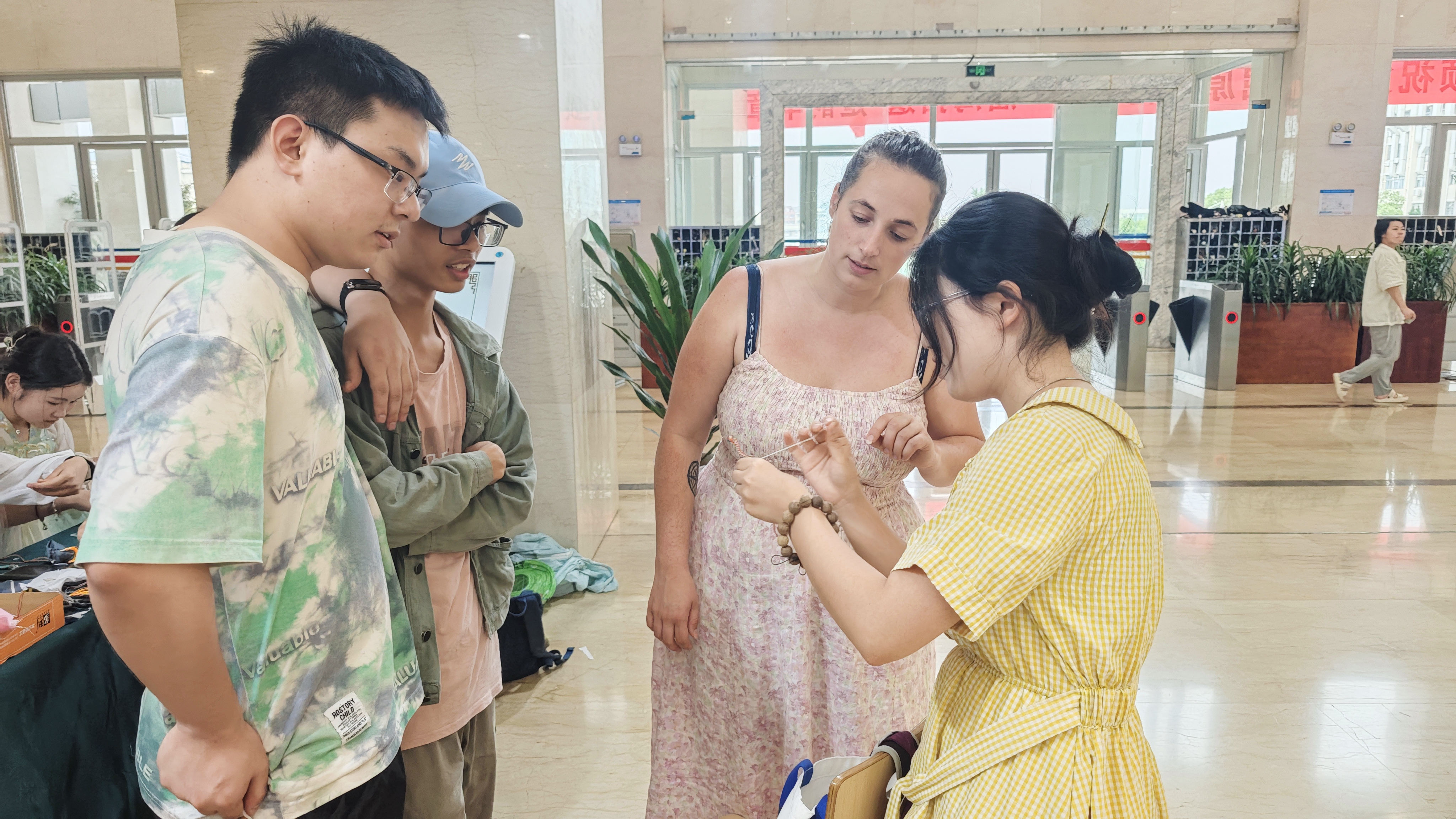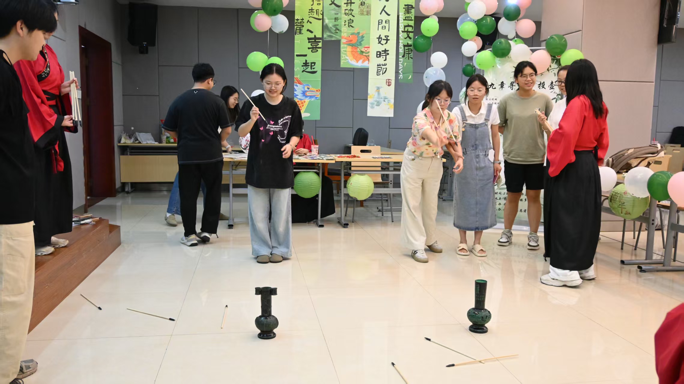 随着一首悠扬的古琴曲《渔家傲》,游园会正式拉开了序幕。活动分为“天问寻踪”“香草美人”“屈子雅集”“九歌粽情”“灵均风华”“楚歌长魂”“九章寻迹”等七大区域,对应猜灯谜、香囊制作、屈原文化展览、包粽子、传统剪纸、古琴表演、投壶游戏七大游园项目。图书馆大厅装扮一新,穿廊入室,汉服翩翩、丝竹隐隐。剪纸台前,“巧手裁云纸生花”,读者以红纸为舟,剪出屈原叩问苍天的激昂;香囊案头,“彩丝缠臂缀兰芳”,艾草与彩线在指间翻飞,织就出驱疫祈福的愿景;屈子雅集展区,一部部泛黄典籍诉说屈原和端午的前世今生;大厅西侧,投壶区破空之声不绝,铜壶斜倚,羽箭轻掷,或中或偏皆引来阵阵喝彩;包粽区最是喧腾,青箬叶裹白玉团,青翠粽叶在指尖舒展如舟,雪白糯米裹着蜜枣豆沙坠入掌心,师生围案笑语,缠绳打结间,连空气都浸透了甜糯的暖意。