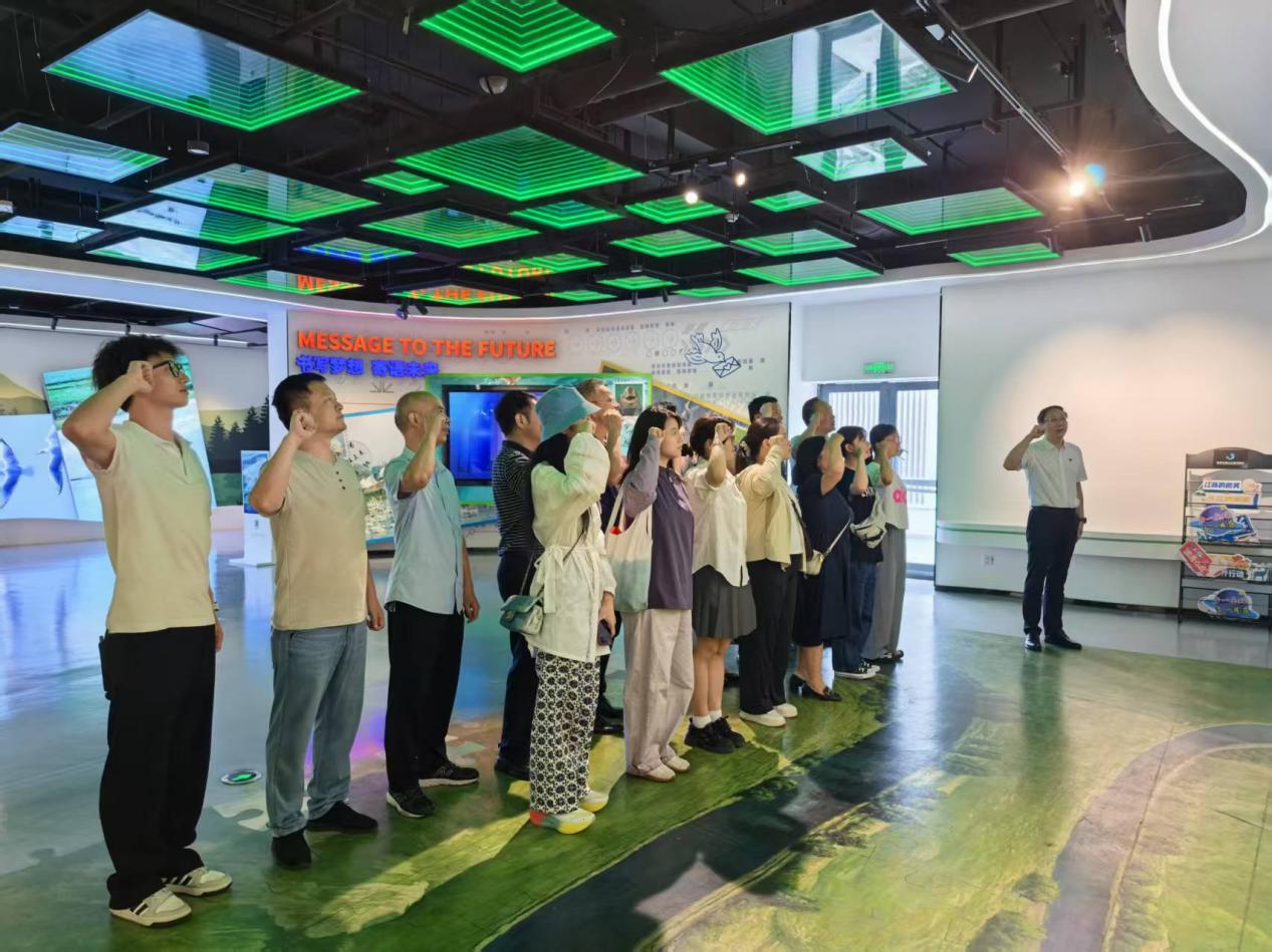 党员老师们走进 “守护好一江碧水”首倡地陈列馆参观学习,这里以“守护好一江碧水、创建人类文明新形态”为主题,通过图片、文字、影像等形式,展现了岳阳大美江湖的生态底色。通过多媒体互动场景,大家仿若置身江畔湿地,沉浸式感受“麋鹿的倩影”“江豚的微笑”“候鸟的欢歌”等一系列人与自然和谐共生场景。