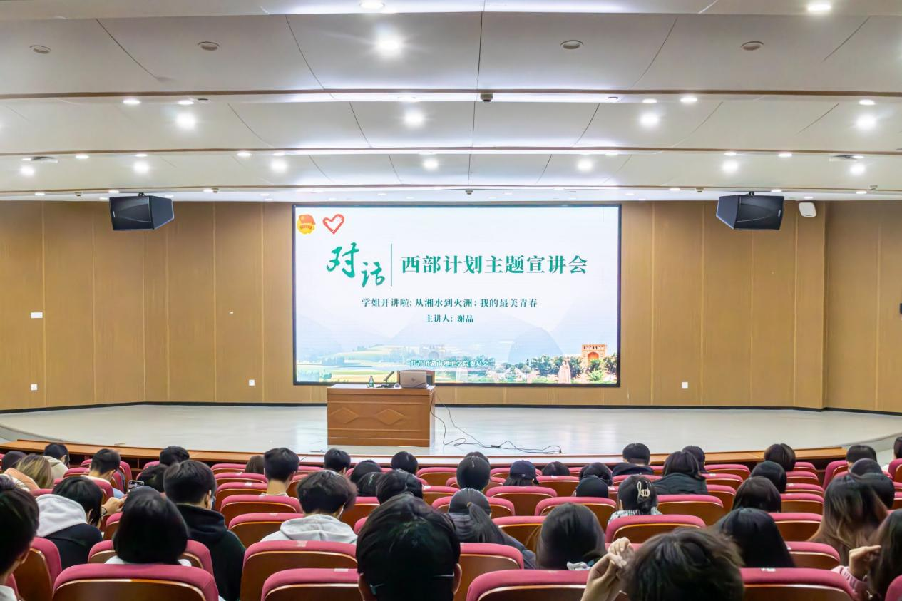 宣讲会以“从湘水到火洲:我的最美青春”为主题,号召同学们“到西部去、到基层去”。谢晶结合自身经历,细数在西部服务期间的所见所闻、所感所悟,系统解读了生活补贴保障、升学加分、就业定向招录等西部计划优惠政策,在打消学子们参与顾虑的同时,更让大家明晰了在西部基层成长成才的广阔空间。