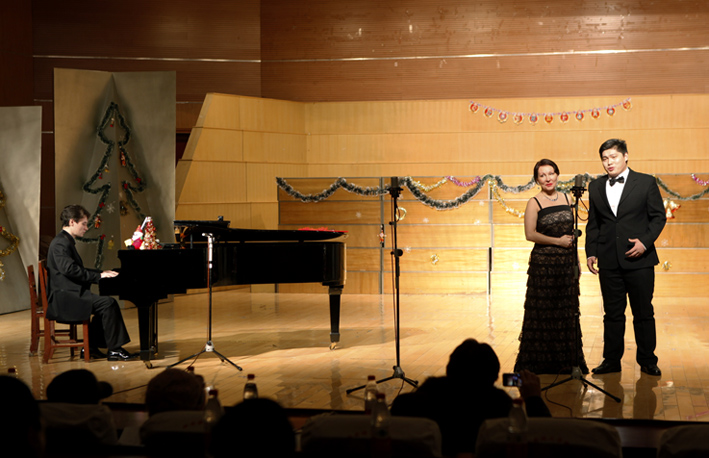 校园网讯 12月26日晚七点半,俄罗斯声乐外教叶莲娜•比扬科夫斯卡娅的教学汇报音乐会暨圣诞晚会——“祝你平安”在学校音乐厅成功举办。校党委书记彭时代出席,党委宣传部、团委、国际交流处和音乐学院负责人参加了本次音乐会。