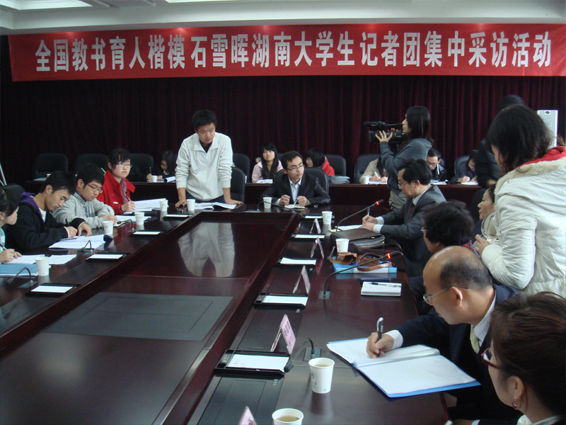 校园网讯 12月1日, 由湖南省教育厅主办的全国教书育人楷模石雪晖先进事迹报告会在湖南大学举行, 湖南省委副书记梅克保,省政府副省长郭开朗出席报告会。我校宣传部组织大学生记者团参加本次报告会,并在随后举行的大学生记者团集中采访活动中和省各高校大学生记者团一道对石雪晖教授进行采访。