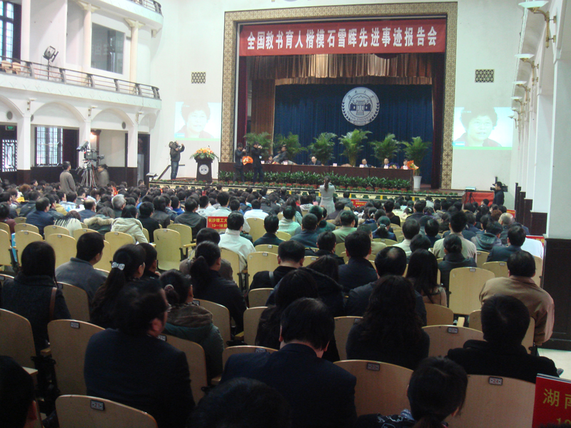 今年教师节前夕,石雪晖被教育部和中央主要新闻单位联合评选为首届全国十大教书育人楷模之一,受到了胡锦涛总书记的亲切接见。报告会上,石雪晖同志汇报了自己教书育人的体会,湖南农业大学教授、博士生导师杨国顺,石雪晖教授的博士研究生韩艳婷,光明日报记者唐湘岳分别从不同角度,饱含深情地报告了石雪晖同志的先进事迹。(学生记者/邓操龙)