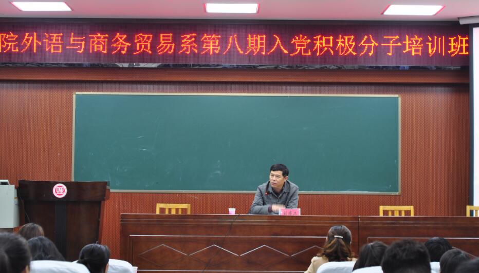 校园网讯4月9日晚,南湖学院外语与商务贸易系在6号楼学术报告厅举行了2017年入党积极分子培训开班仪式。校党委委员、副校长刘亦工,南湖学院负责人,外语商贸系党总支负责人及学工线全体教师、学生党员代表及本期186名入党积极分子参加开班仪式。开班仪式由外语商贸系书记陈涉老师主持。