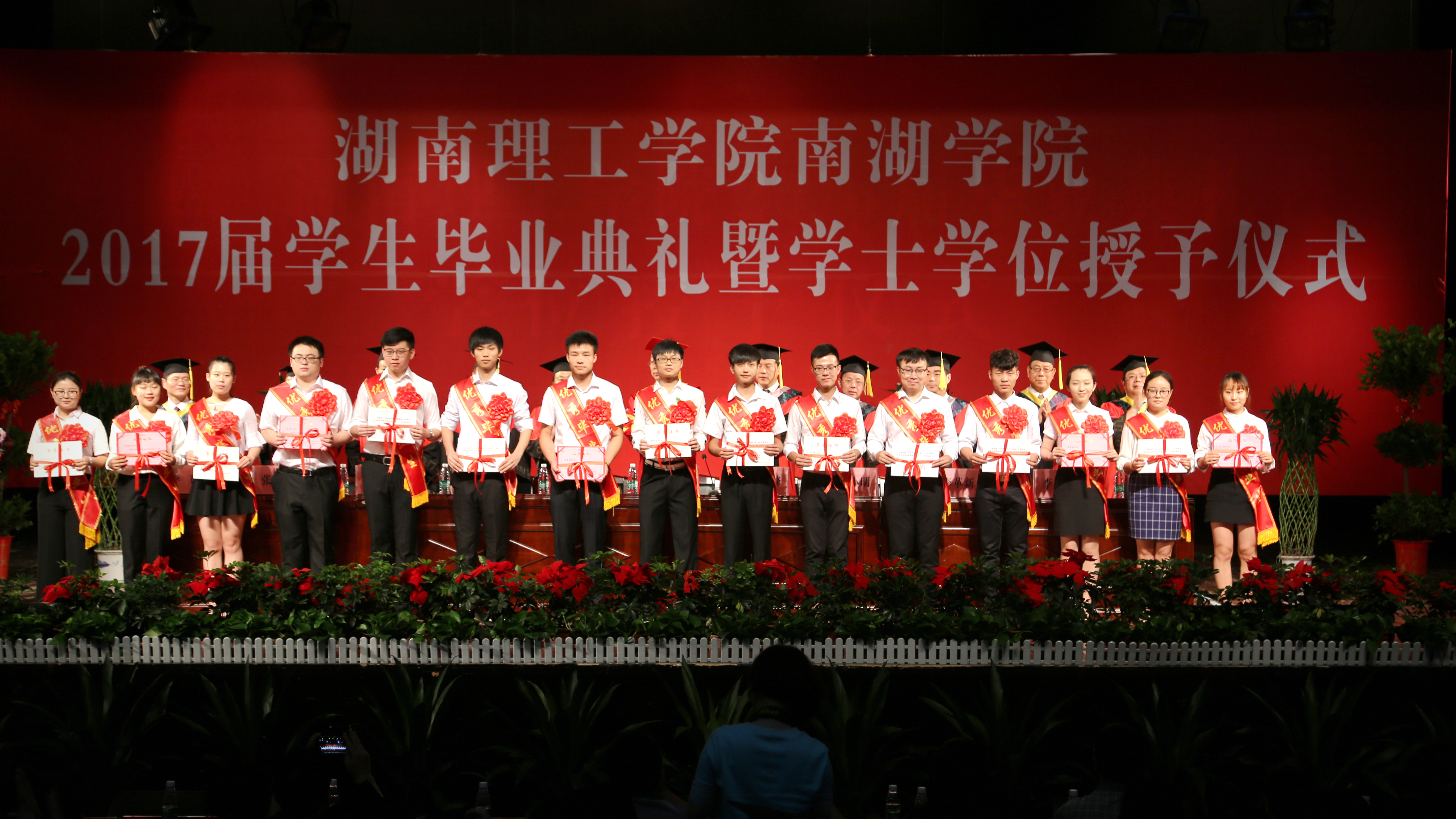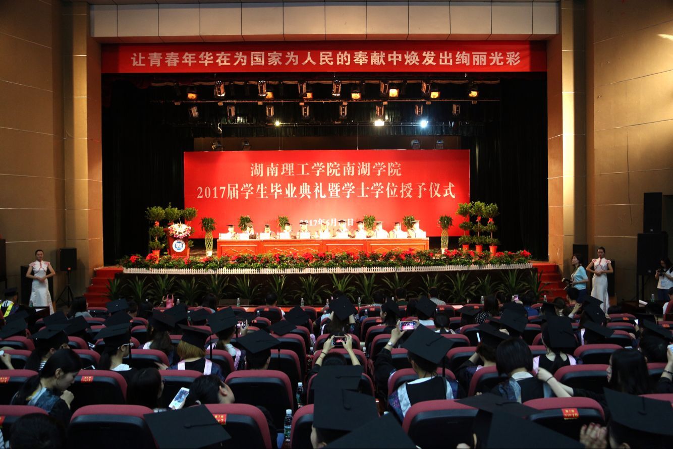 毕业典礼在雄壮的国歌声中正式拉开帷幕。南湖学院负责人分别宣读了《关于表彰2017届省、市、院级优秀毕业生的决定》、《湖南理工学院南湖学院关于2017届本科生准予毕业与授予学士学位的决定》、《关于聘任丁子旋等38名同学为学院2017届毕业生校友工作联络员的通知》。毕业生们身着学士服依次列队上台,与会领导及学位委员会的老师们为他们一一拨正流苏,颁发学士学位证书,并合影留念。