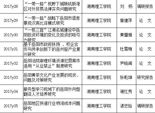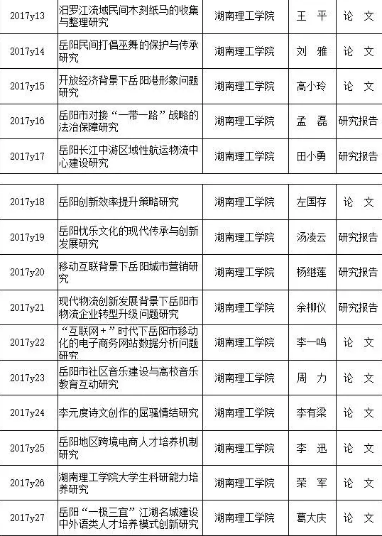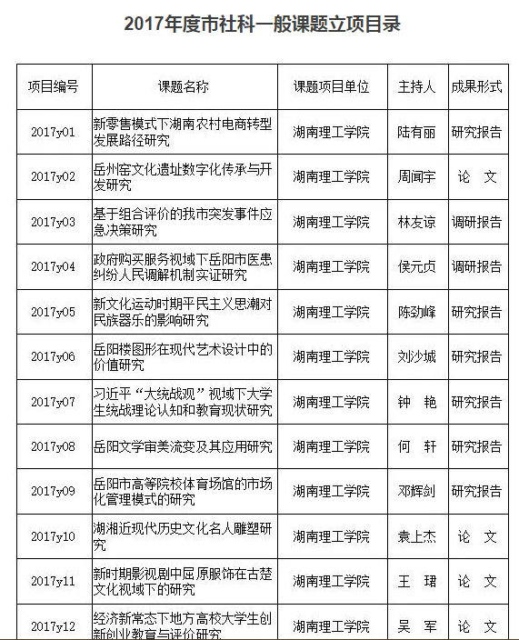 岳阳市社科课题旨在为岳阳市提供具有前瞻性、对策性和应用性的成果。2017年度我校申报的课题,体现出我校教师能根据岳阳市地域特色有针对性地进行研究,找准服务地方经济文化的切入点;也体现出我校教师对岳阳市经济社会发展的关注与支持。(责编/潘昕)