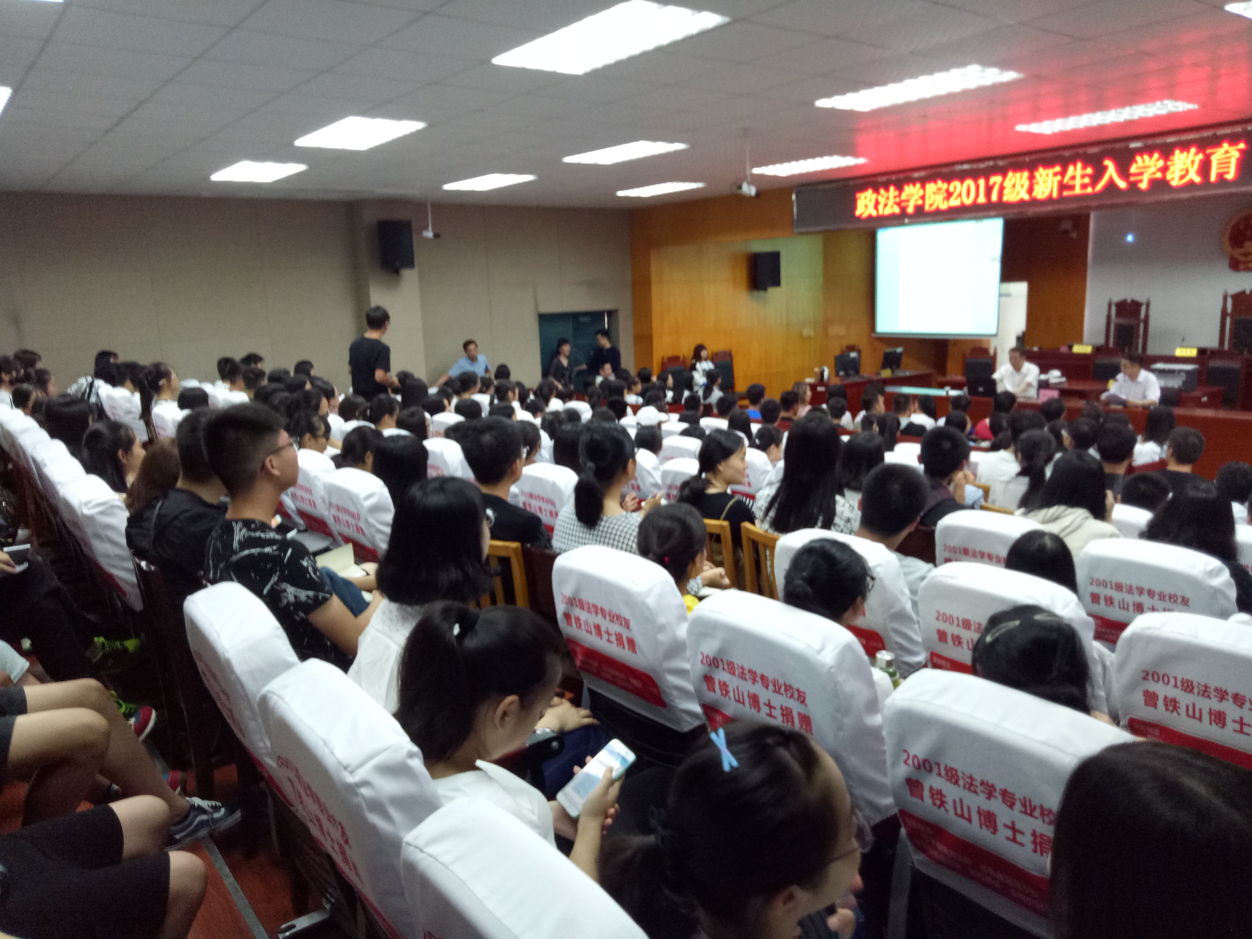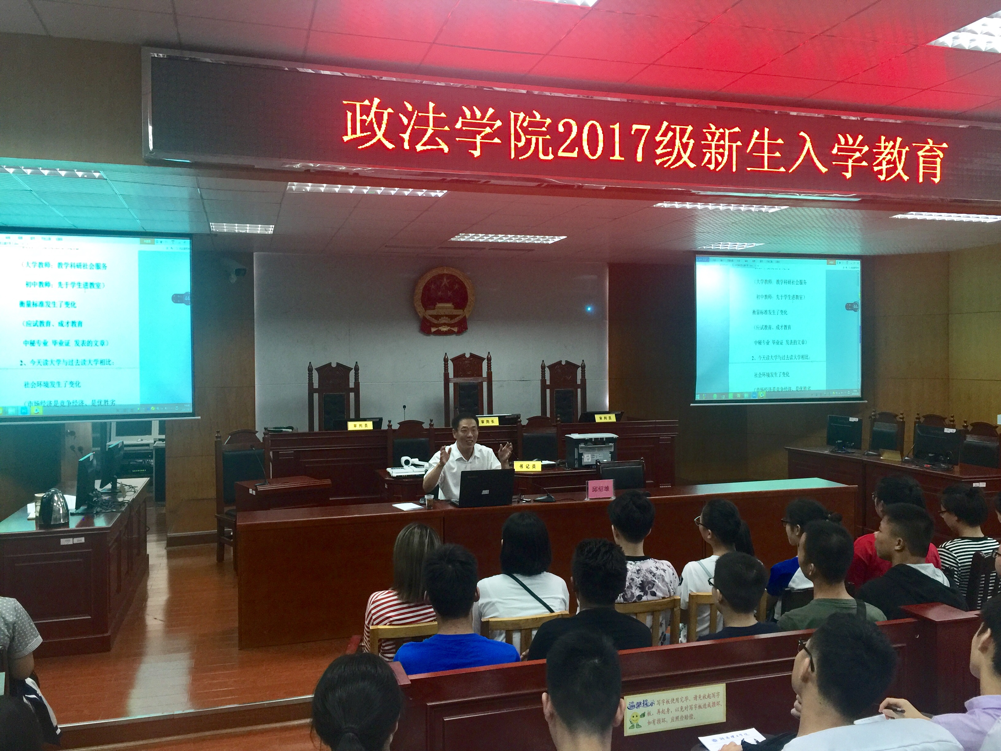 校园网讯 政法学院2017级新生入学教育第二场讲座于9月10日下午在8号楼模拟法庭举行。党委副书记邱绍雄教授到场给新生主讲“今天我们怎么读大学”。政法学院负责人,班主任、辅导员以及2017级全体新生到场听讲座。
