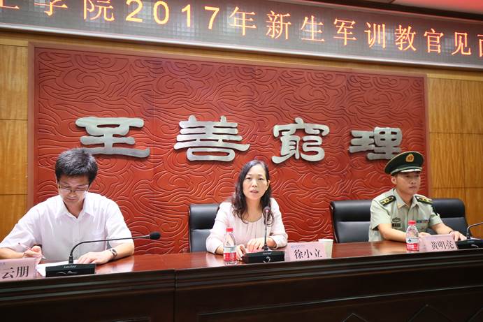 徐小立在会上指出,学校历来重视对学生特别是新生的军事训练工作,这不仅是国家现代化军事后备建设的必经之路,还是学校对大学生进行国防教育的第一课。她对教官提出了"三个希望":一是希望给同学们树立好的榜样,让新生明白军训的严肃性与国家国防的重要性;二是希望通过军训锤炼出学生钢铁般的意志,不能降低训练要求,严格按照训练标准展开训练;三是希望让新生切身体会铁一般的纪律,从而形成优良的学习生活作风。她表示,很期待新生以飒爽英姿接受学校党委行政和武警岳阳支队的检阅。