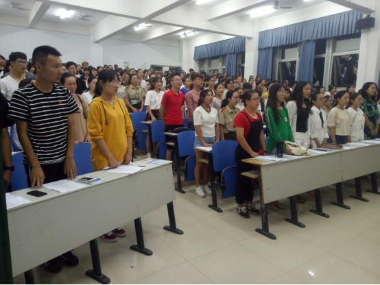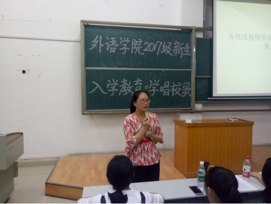 校园网讯 9月14日晚,外语学院组织全体2017级新生在15308教室学唱校歌。学工办负责人以及2017级各班助理班主任到场组织,全体新生参加此次活动。