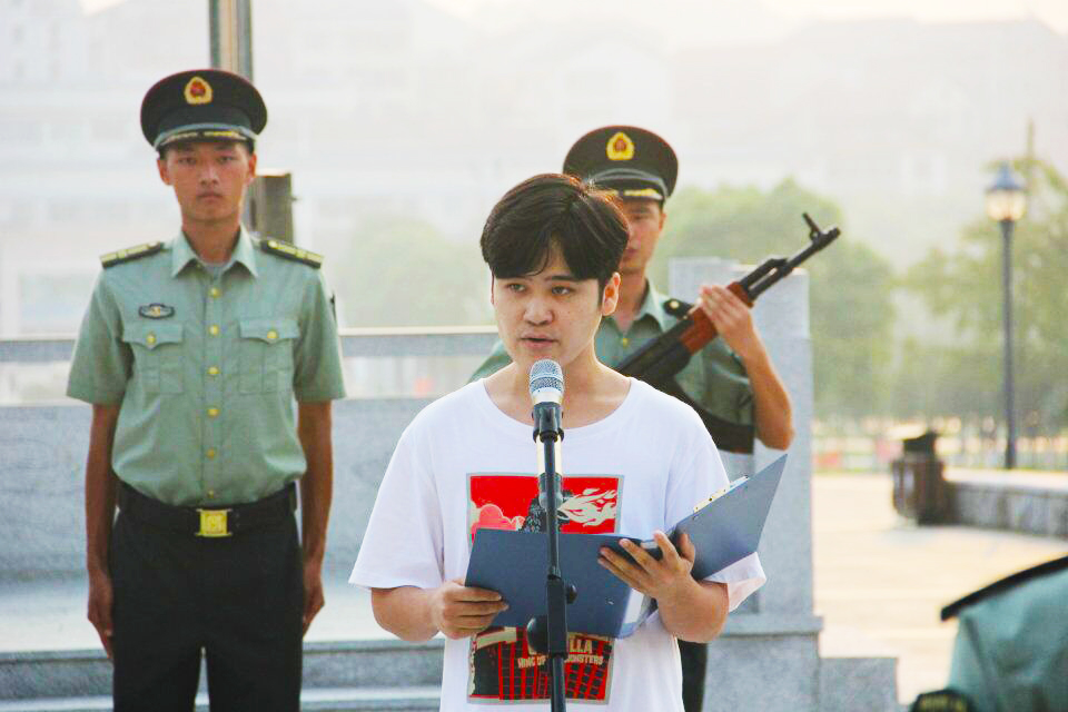 升旗完毕后,环境设计班的张庆喆同学代表全体学生作了主题为“在践行中成长”的发言,他号召全院同学学习运用专业知识,成为各行各业的优秀人才,承前启后,继往开来,致力于国家的现代化建设,用实际行动贡献自己的一份力量。