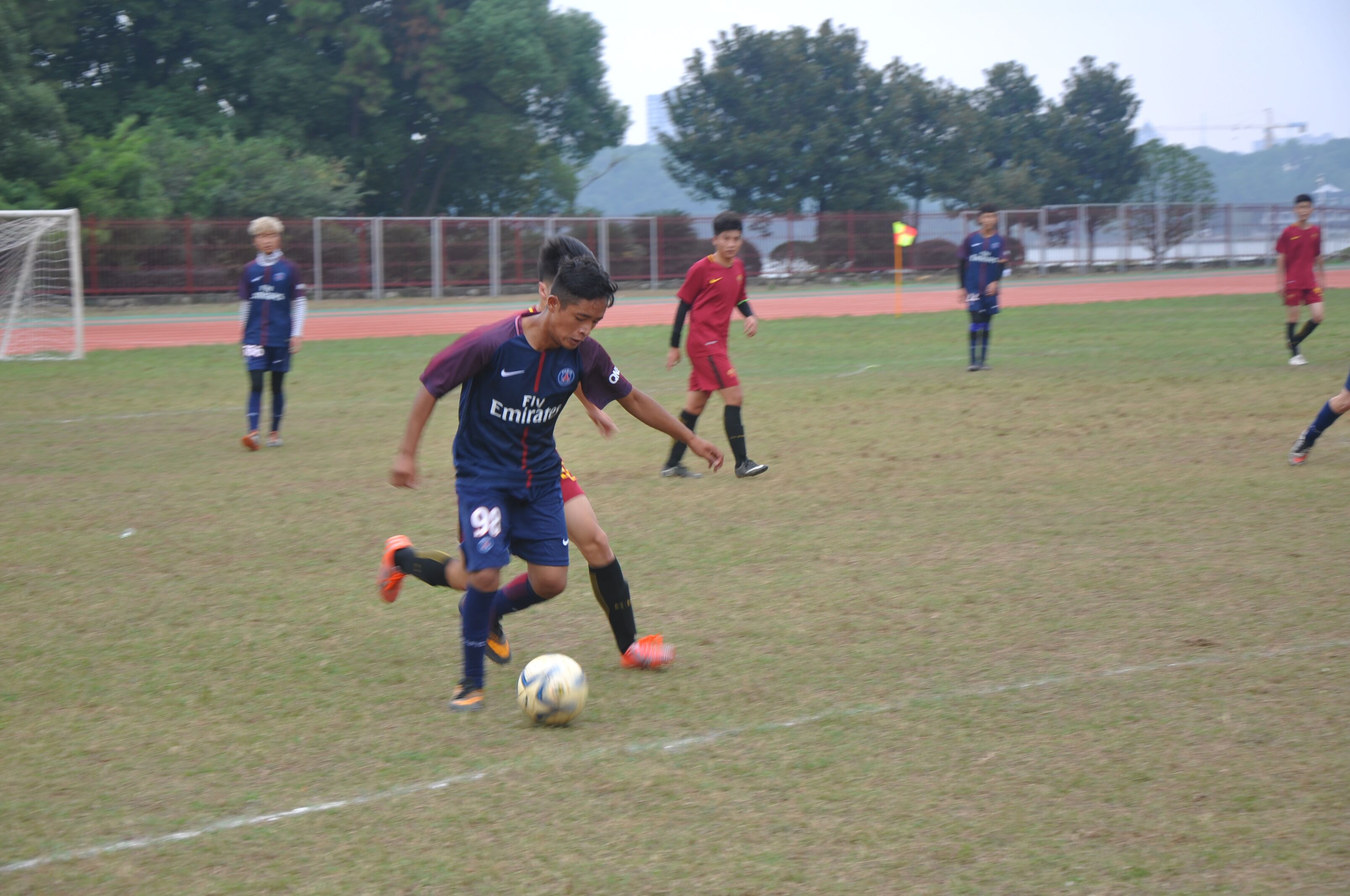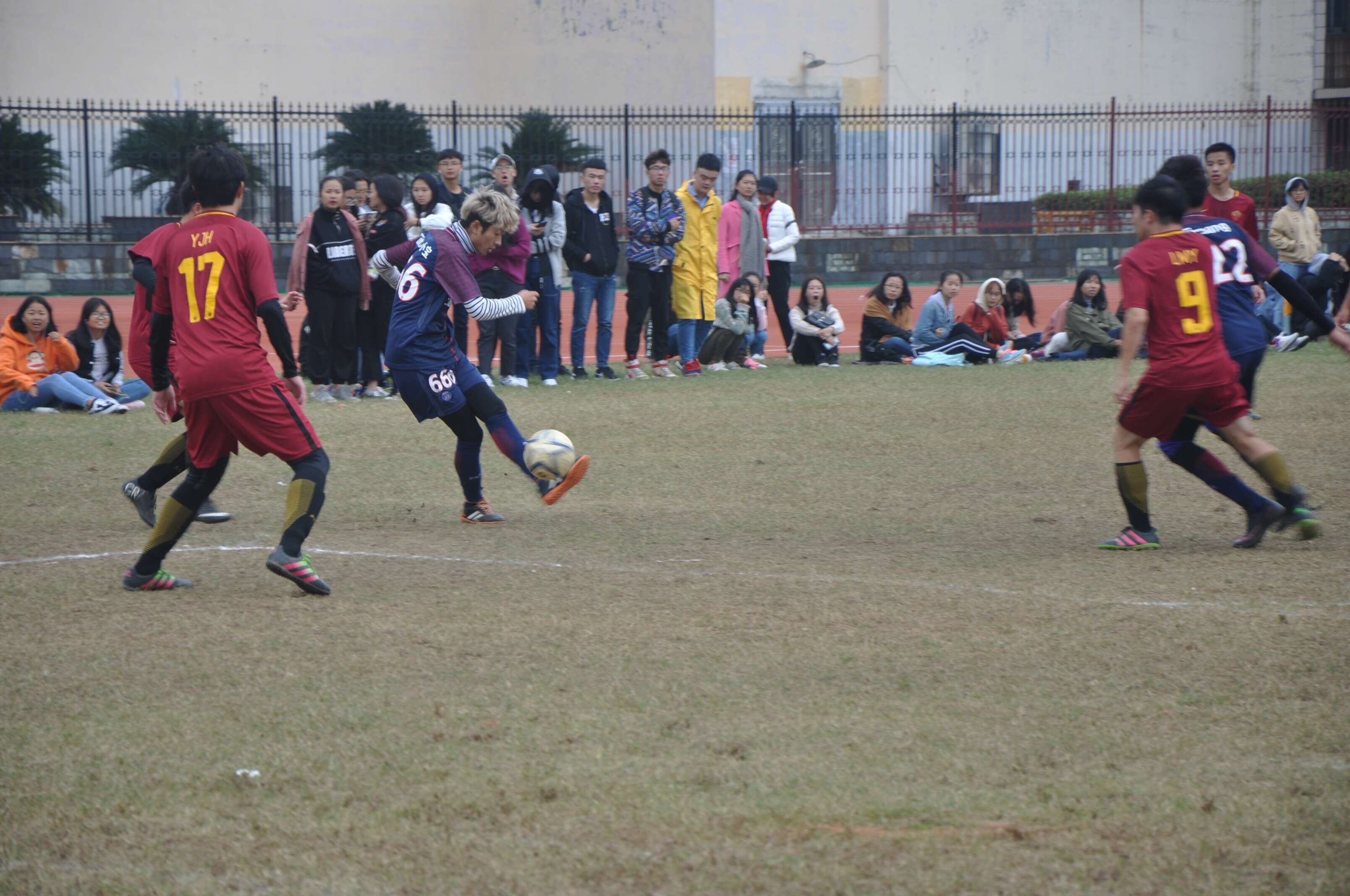 校园网讯10月15日上午,“校园杯”足球赛小组赛在北院田径场正式打响,新闻学院对战同组的第一个对手政法学院。上半时政法学院16号球员梅开二度,分别在门前与禁区弧顶前取得进球,此后新闻学院29号球员前场得球吊射破门,政法学院10号禁区前抽射破门。下半时政法学院牢牢掌握球权,新闻学院多次尝试未果。最终比赛结束,新闻学院1比3负于政法学院。