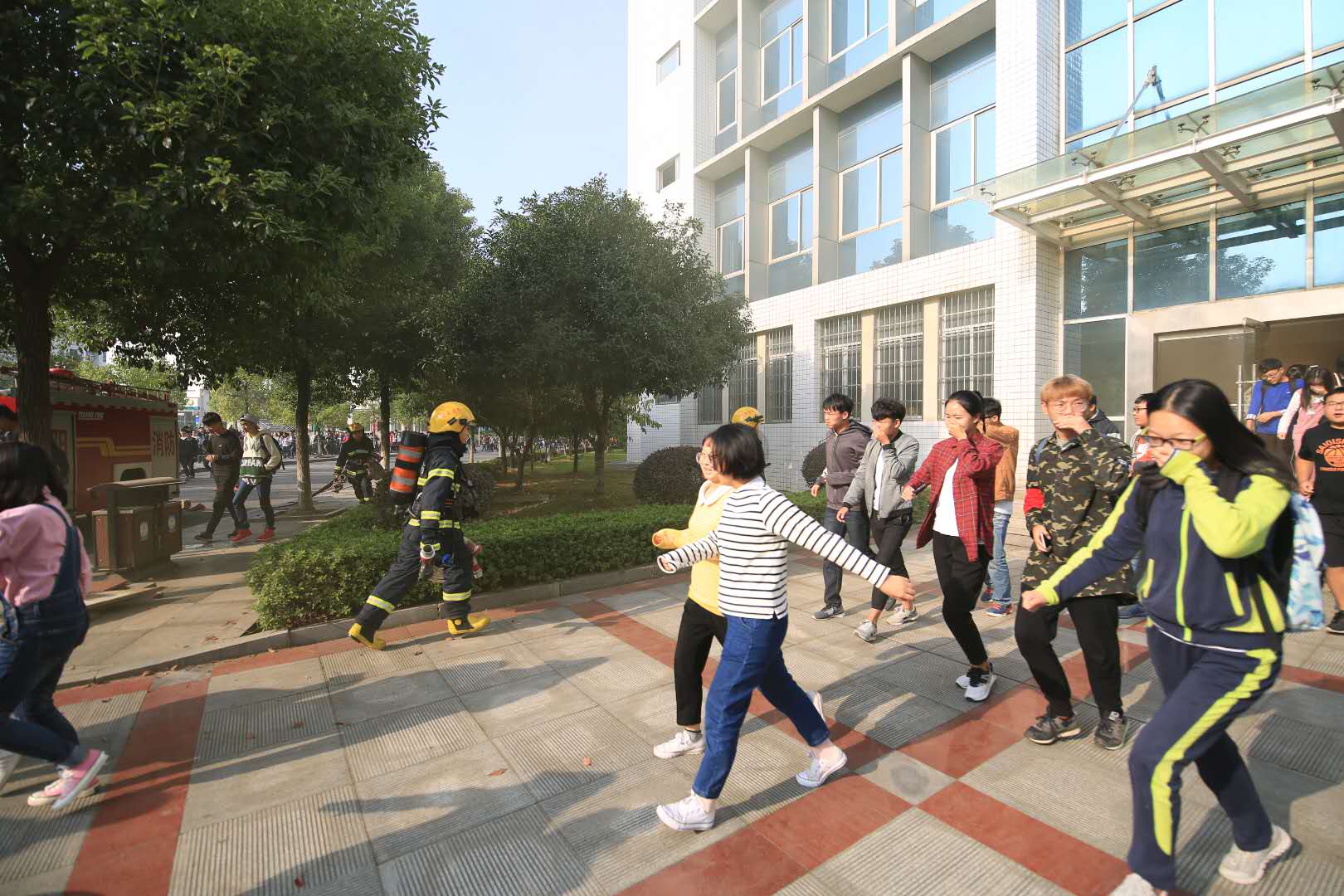 学校举行新生消防疏散现场演练