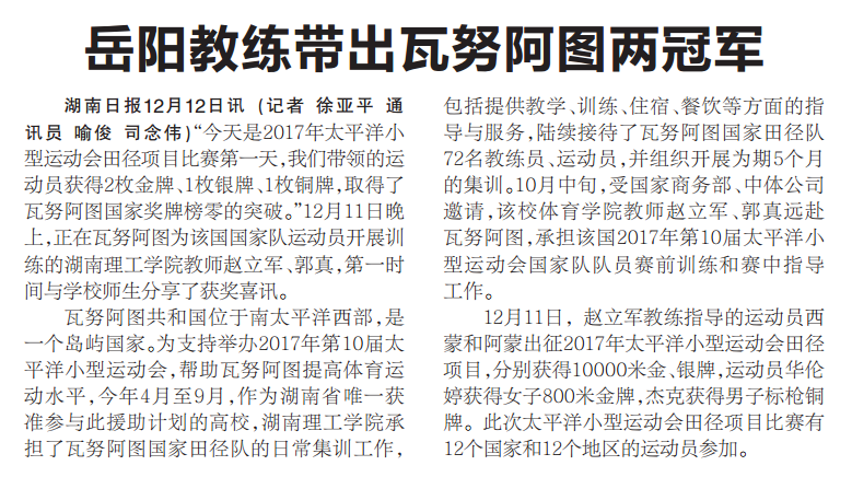 湖南日报12月12日讯(记者 徐亚平 通讯员 喻俊 司念伟)“今天是2017年太平洋小型运动会田径项目比赛第一天,我们带领的运动员获得2枚金牌、1枚银牌、1枚铜牌,取得了瓦努阿图国家奖牌榜零的突破。”12月11日晚上,正在瓦努阿图为该国国家队运动员开展训练的湖南理工学院教师赵立军、郭真,第一时间与学校师生分享了获奖喜讯。