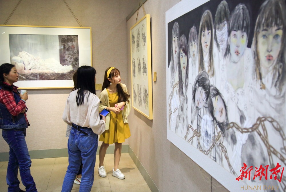 4月10日,湖南理工学院美术与设计学院展厅,观众在参观美术作品展览。又到一年毕业季,该学院举办的2018届美术学专业毕业创作展上,88名学生联袂展出了近100幅(组)美术作品,以开展交流学习,供市民免费参观。 湖南日报记者 徐典波 摄影报道