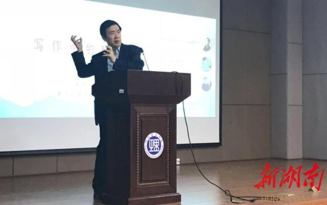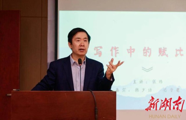湖南日报·新湖南客户端(记者 徐亚平 见习记者 何梦君 吴广)“为什么当代作家很少用‘兴’的手法写作了?因为现代人缺乏一种飞扬激越的生命力,很少人会为了一只鸟、一棵树感动……”10月31日下午,秋阳高照,湖南理工学院图书馆内书香弥漫。当代著名作家张炜先生驾到,这个对当代社会有着深刻洞悉的充满着理想主义情怀的文学大家,带来了主题为“写作中的赋比兴”的讲座,与广大师生一起探寻中国的文学艺术手法的独特魅力。