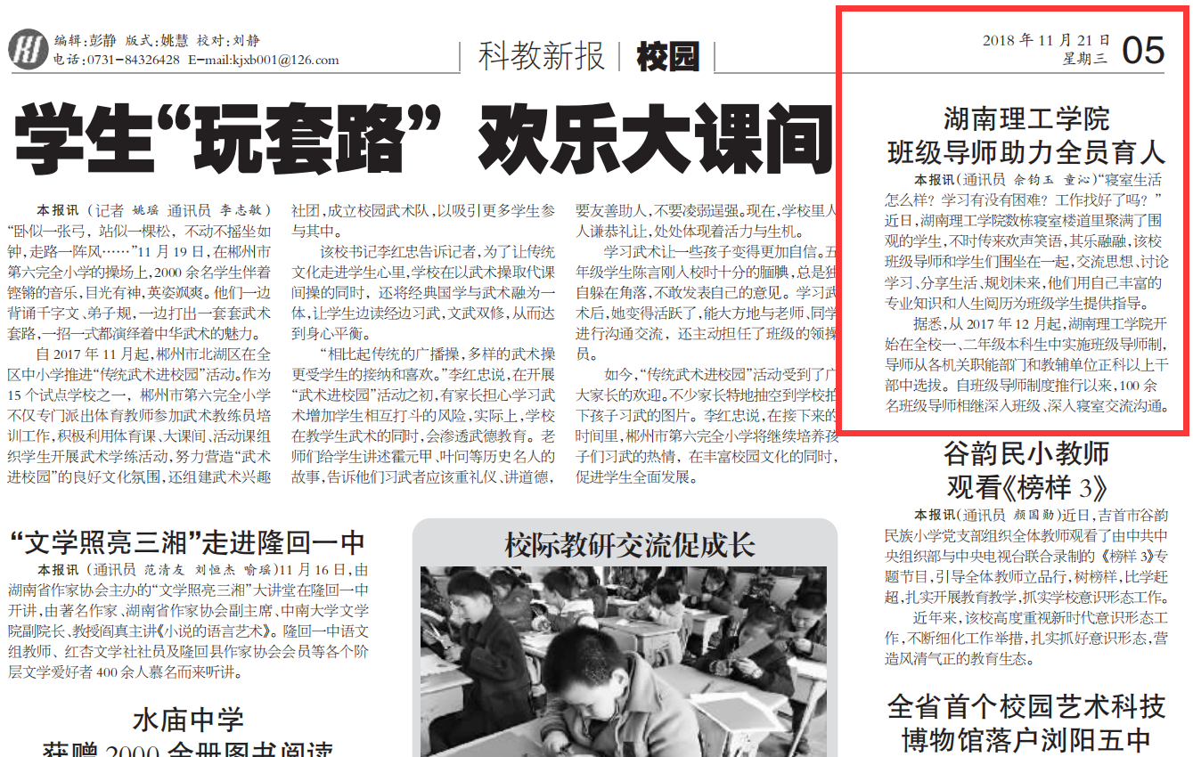 据悉,从2017年12月起,湖南理工学院开始在全校一、二年级本科生中实施班级导师制,导师从各机关职能部门和教辅单位正科以上干部中选拔。自班级导师制度推行以来,100余名班级导师相继深入班级、深入寝室交流沟通。