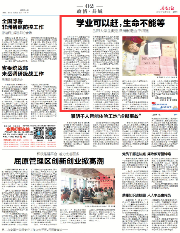 【岳阳日报】学业可以赶,生命不能等——湖南理工学院20岁大学生戴恩泽捐献造血干细胞