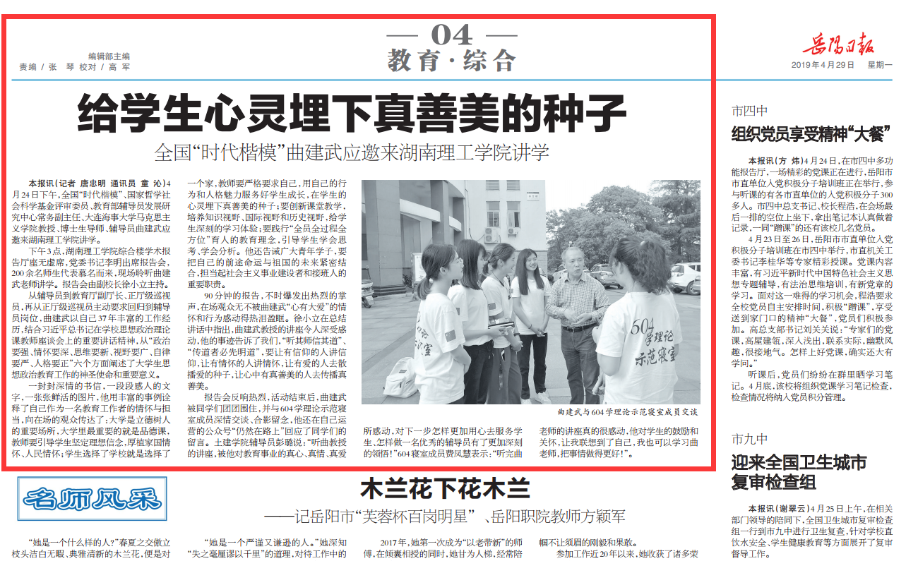 【岳阳日报】全国“时代楷模”曲建武应邀来湖南理工学院讲学