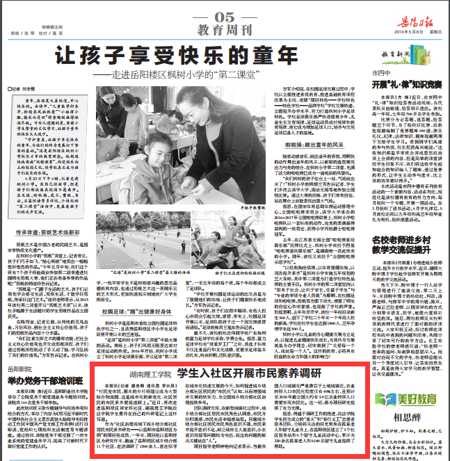 本报讯(记者 唐忠明 通讯员 罗小旦)“村民变市民,原来的乡村将建设成为大型综合物流园,这是城市化的新变化,社区居民的市民素养要提速跟上。”近日,再次走进岳阳楼区胥家桥社区,湖南理工学院政法学院学生曹丹在自己的科研笔记上这样写道。