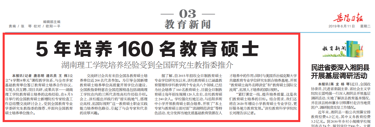 本报讯(记者 唐忠明 通讯员 王 炜)设立“4学期8单元”课程教学体系,与全市多家基础教育单位签订教育硕士培养合作协议,实现人员互聘、项目共研、成果共享……湖南理工学院教育硕士培养的这些经验,在6月5日举行的全国教育硕士新增院校专家检查工作总结暨交流研讨会上,受到全国教育专业学委研究生教指委的推荐,并面向全国教育硕士培养单位推介。