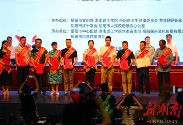 2018年,岳阳市无偿献血献髓取得突破,全市医疗临床用血100%来自无偿献血,造血干细胞捐献已达194例 ,走在全国地市级先进行列。岳阳连续8次被评为“全国无偿献血先进市”,市无偿献血志愿者服务队获得“全国无偿献血先进集体典型代表”,湖南理工学院获评全国无偿献血“促进奖”。