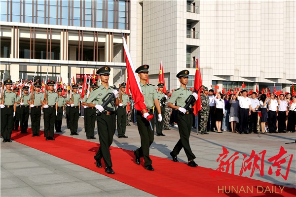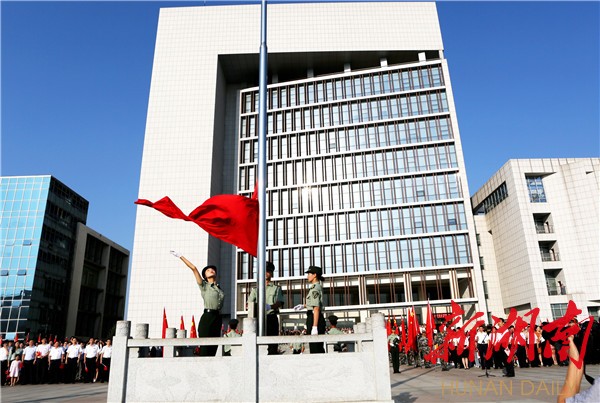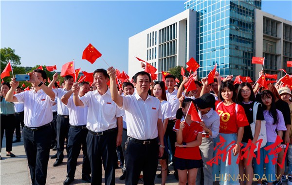 湖南日报·新湖南客户端10月1日讯(田夏 屈艳)秋日南湖畔,天空湛蓝,红旗飘扬。今天上午,湖南理工学院千余名师生在国旗广场举行升旗仪式,庆祝中华人民共和国成立70周年。