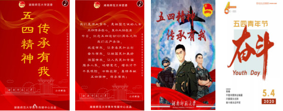 湖南师范大学结合“抗击疫情”“五四纪念”等实时热点,制作“青春战役”“五四特刊”系列推送10余条;组织开展“五四精神,传承有我”万人线上接力宣誓活动,向全校团员青年发布“传承五四,勇担使命”的强国号召,累计超过3万余人次在线宣誓。湖南城市学院以五四青年节为契机对“第十七届十佳大学生”和“湖南城市学院大学生“抗疫先进个人”榜样进行了宣传报道;自制“爱国、进步、民主、科学”五四主题海报、《使命在肩 奋斗有我》2020春季开学青春主题片,加强对青年师生的思想教育。湖南理工学院推出“五四青年说”系列推文,讲述五四奖章获得者的故事,传播校园青春正能量;制作《习近平总书记寄语新时代青年,湖理学子:我想说……》,收集了来自各学院的优秀感想,与同学们一起分享学习寄语精神的所感、所得。