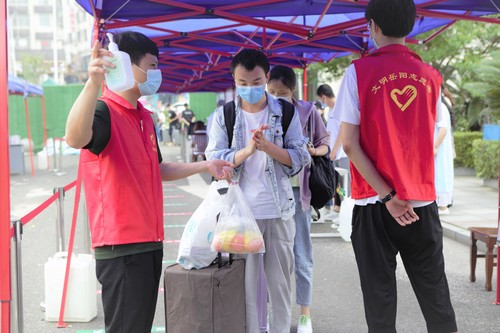 志愿者帮助返校学生进行消毒