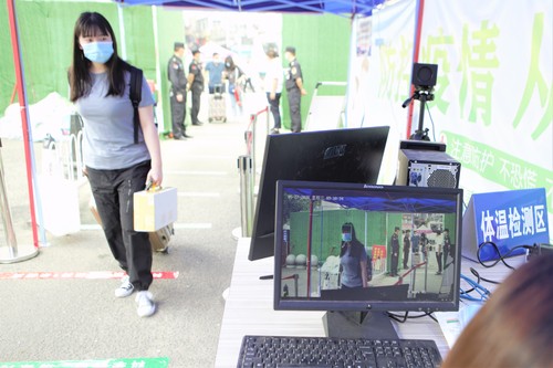 学生们排队进行体温检测