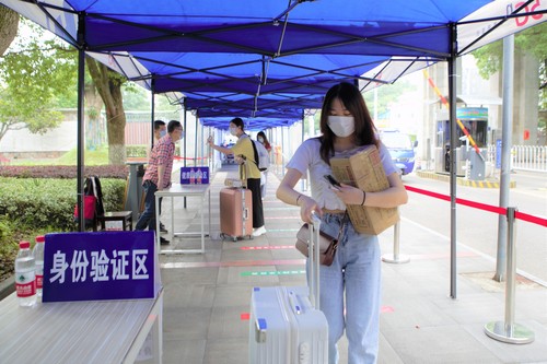 早上8:00,岳阳东站、火车站和三荷机场出口都停着学校派出的大巴车,返校学子们表示,看到大巴车上的校徽和校牌,回“家”的熟悉感就来了。校门口,党委书记李明,党委副书记、校长卢先明和其他校领导及教职员工们正在热心引导、关怀返校学生。学生们依次通过检查体温检测、消毒清洁、身份验证等关卡进入校园。