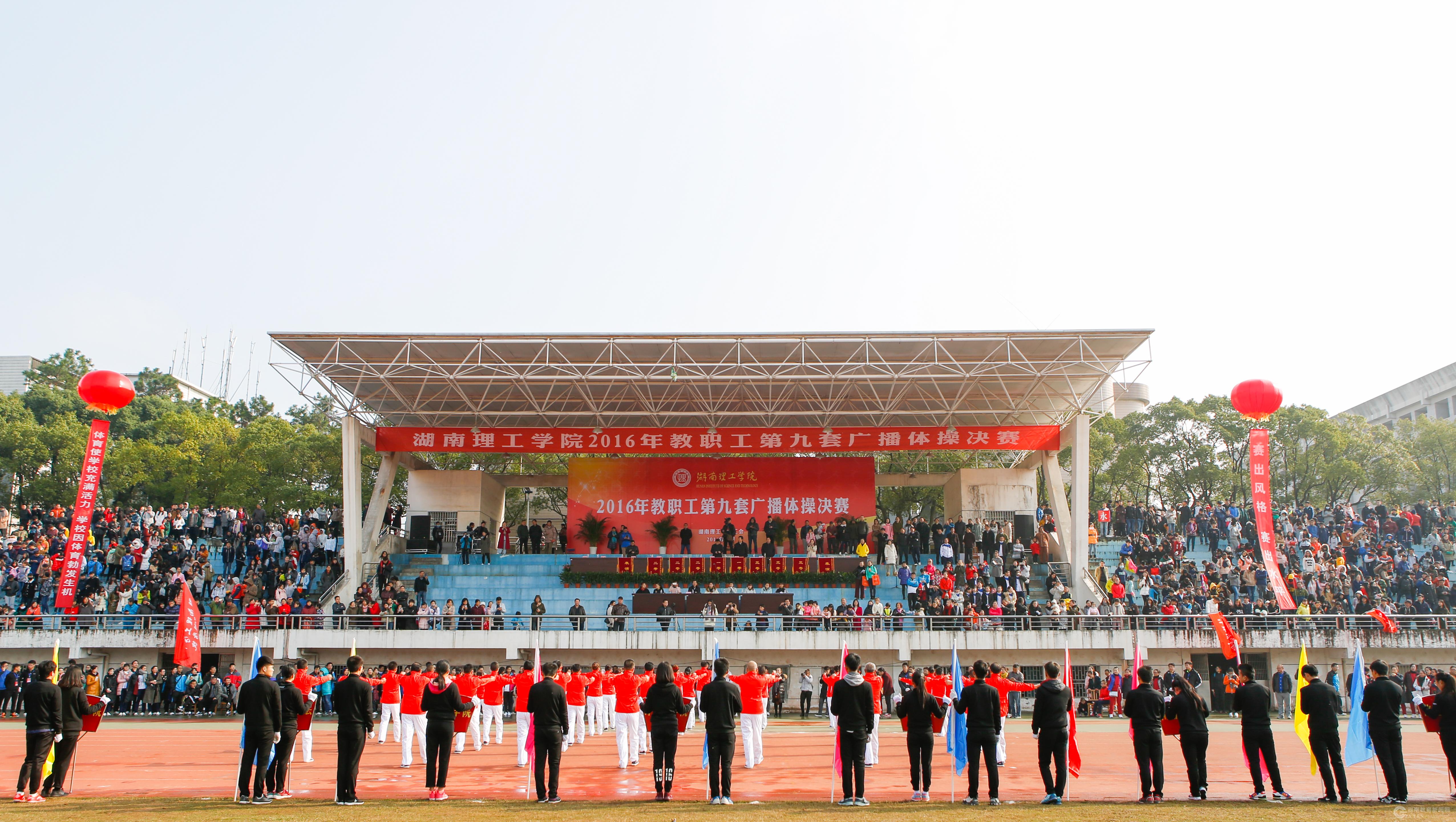 本网讯(通讯员 潘鑫 罗葵 摄影 刘璋)11月26日上午,初冬的太阳在朝霞的迎接中,露出了红彤彤的面庞。在冬日暖阳下,湖南理工学院2016年教职工第九套广播体操决赛在东院田径场精彩举行。